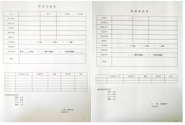 業(yè)務(wù)人員把平面圖和吊頂圖、空調(diào)交接單發(fā)至該群,如果之后機型有所變動,或者此前交接單有錯填、漏填現(xiàn)象,之后可再補發(fā)一個變更單加以更正。
